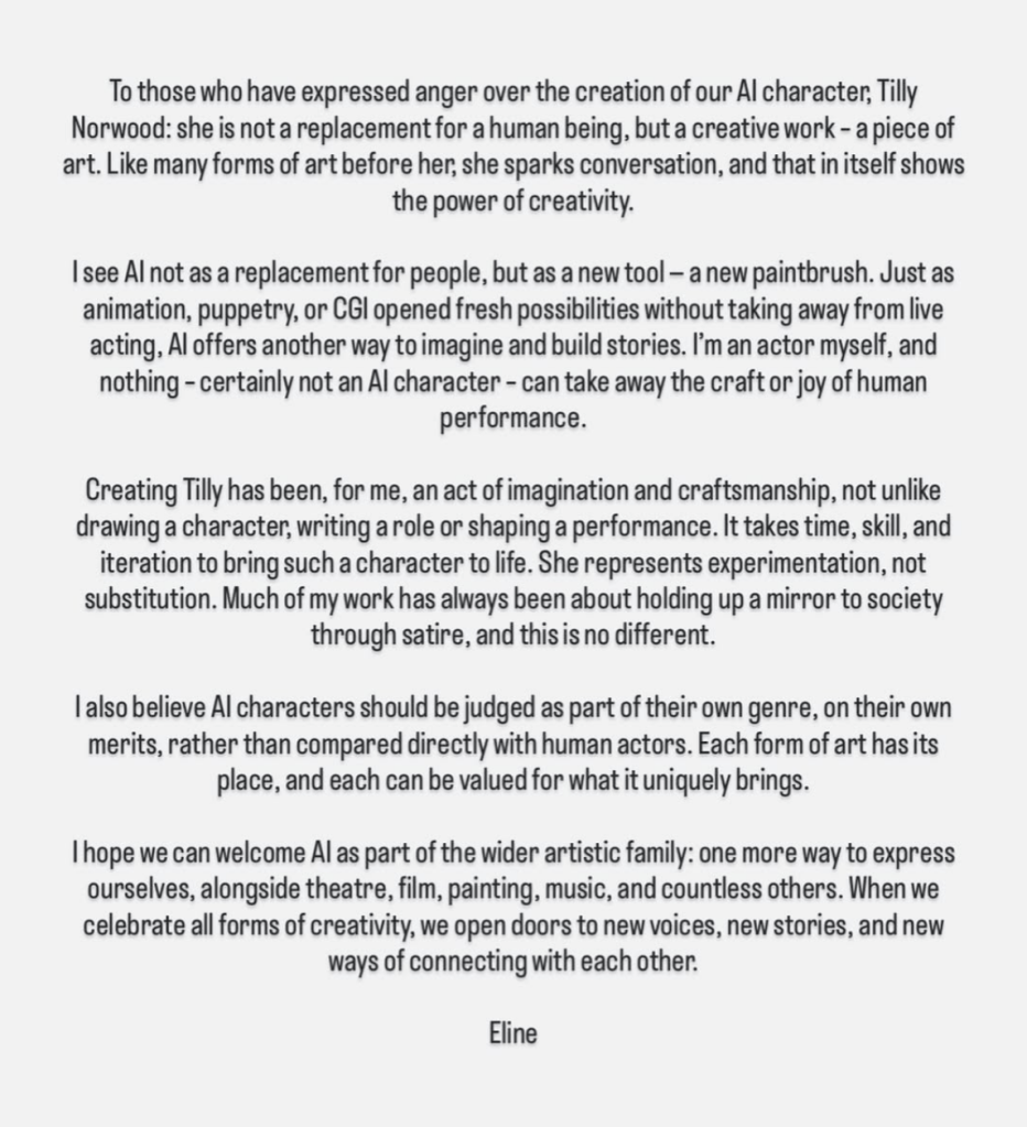 After the unveiling of her “creation” was met with – shock! – backlash from many actors and people in the industry, Eline Van Der Velden released a statement, posted to Tilly’s Instagram account. In it, she claims that Tilly is a “piece of art” not meant to replace humans but to spark conversations, “and that in itself shows the power of creativity.” Girl… no. She compares AI to animation, puppetry, and CGI and argues that her work “has always been about holding up a mirror to society through satire, and this is no different.” I’m sorry, is the satire in the room with us now??? Because I have no fucking clue what you’re saying and I wouldn’t be surprised if you got AI to write this statement too.