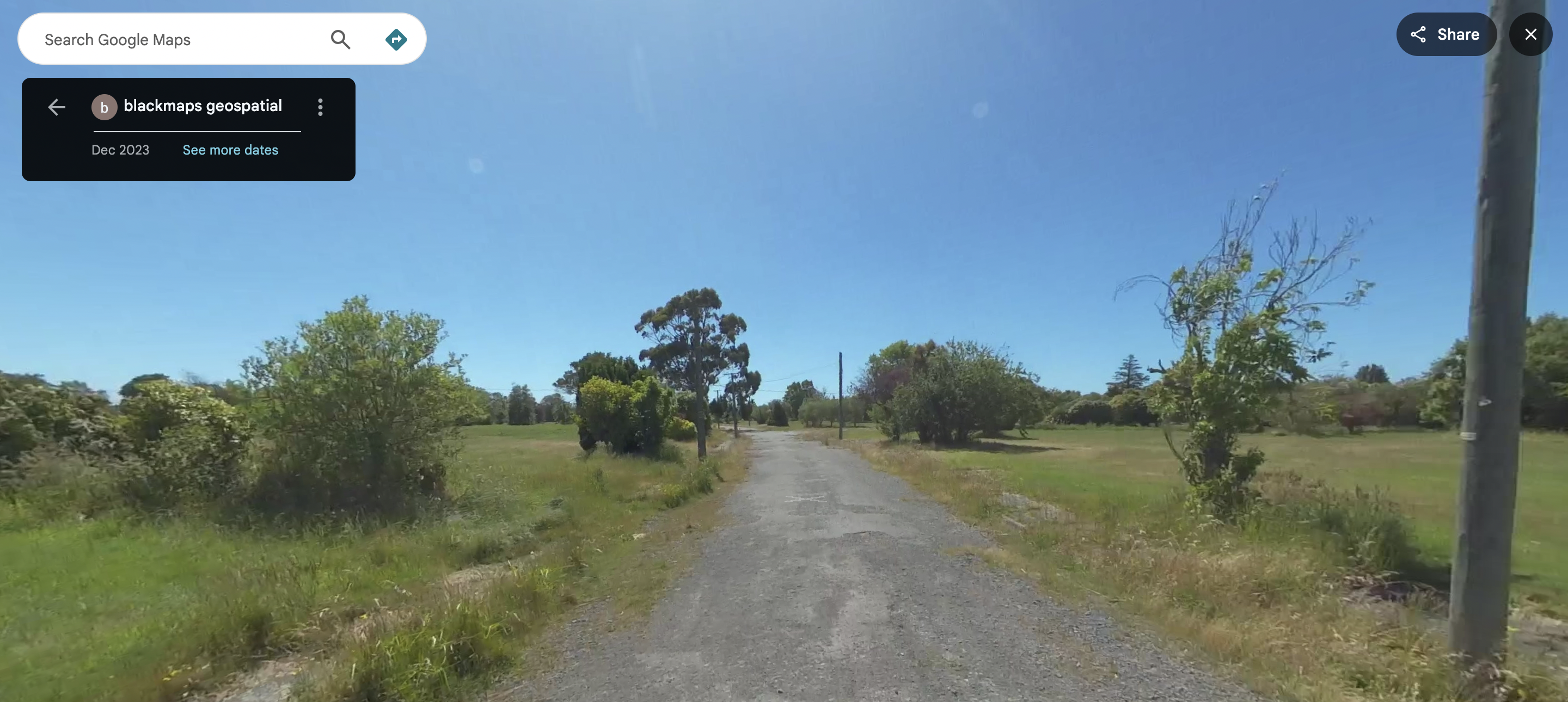 Curious, I searched up blackmaps geospatial, and found a two-person company named after some of the earliest survey plans of Canterbury. Their LinkedIn profile says they were founded in 2023, so their efforts to document the Red Zone in the same year must have been one of their first projects. If you aim the 360 image towards the ground, you can see a person with a flannel shirt and a black helmet on their bike, cycling through the empty streets. They even hop into a kayak to capture parts of the Ōtākaro Avon River. It definitely feels more personal and genuine than the hollow, damaged houses snapped by Google in 2012.