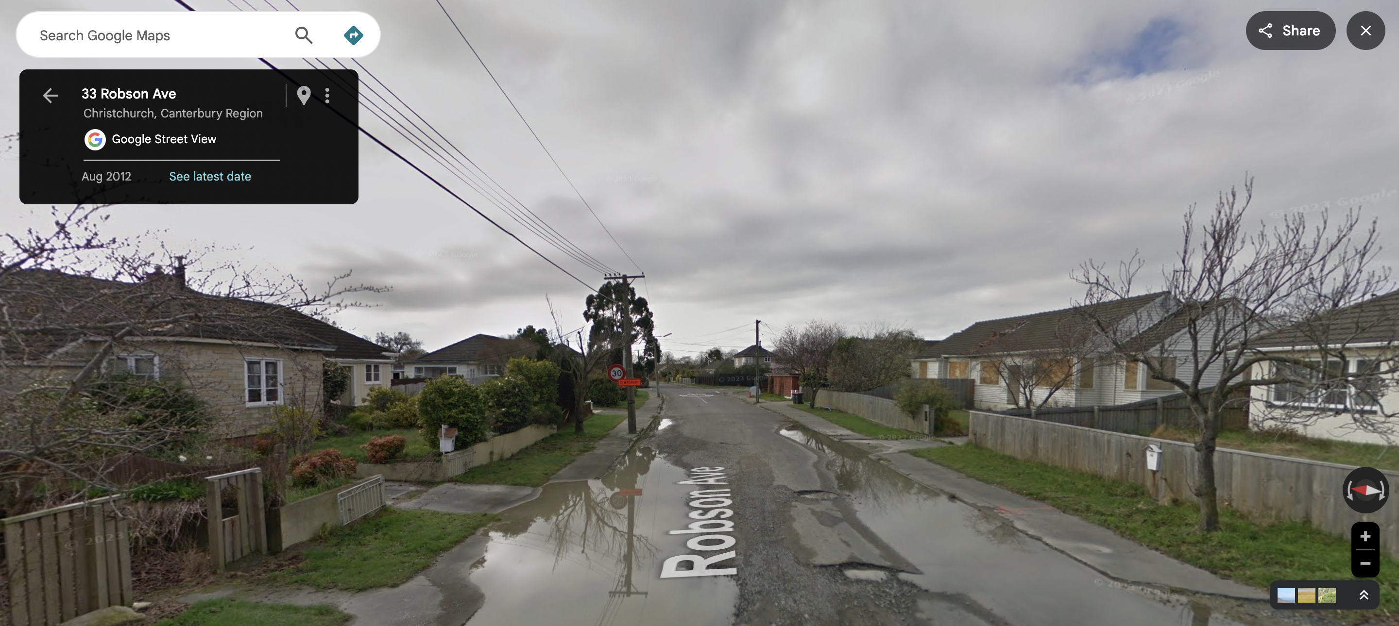 If you click into Street View on the Avonside loop, Google will probably take you straight back to August 2012 – for some areas of the Red Zone, this seems to be the only footage stored by Google. Travelling through these parts of Street View feels jarring and almost voyeuristic: water clogs the gutters, houses sit empty with boarded windows, and the dirty grey remains of liquefaction splatter the cracked roads. Where Street View usually captures the blurry or distorted figures of people going about their day, the loop appears to be utterly deserted – the only sign of human life is the shadow of Google’s 360 camera car.